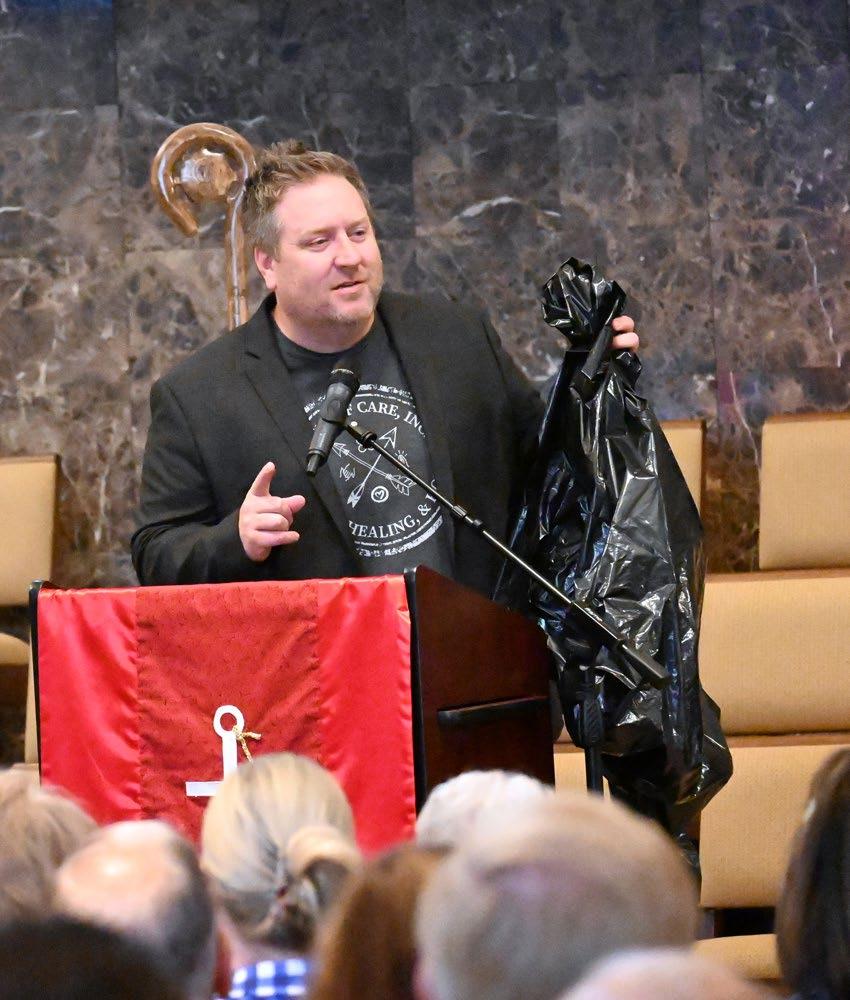 LEFT: Keith Howard, executive director of Circle of Care, shows a concrete example of the way many children in foster care are forced to carry their belongings from house to house during the entity’s report at Annual Conference 2024.