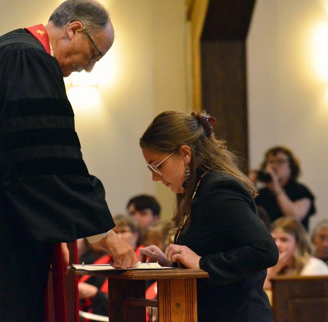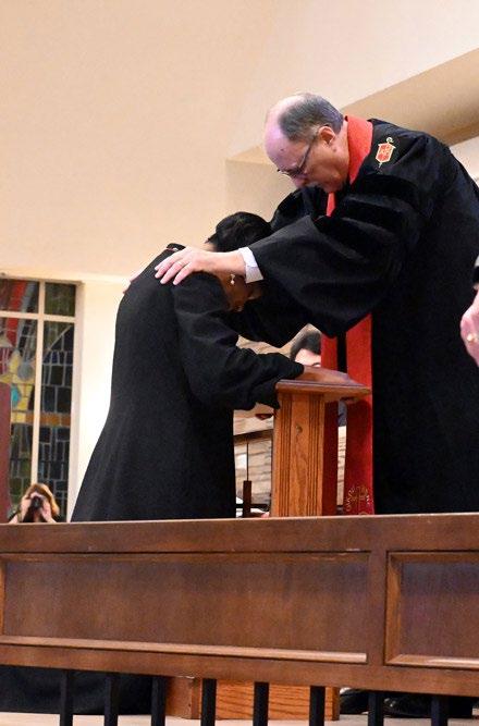PAGE 2 TOP: Bishop Jimmy Nunn speaks over ordinand Aly Shahan, who was ordained as a deacon at Annual Conference 2024 at Chapel Hill UMC in Oklahoma City. BOTTOM LEFT: Rev. Brandon Blacksten places a stole on Rev. Aly Shahan as Bishop Jimmy Nunn assists. BOTTOM RIGHT: Bishop Nunn greets Rev. Michaela Drain as she prepares to receive her stole. Dr. Don Kim looks on. ABOVE LEFT: Rev. Blacksten places Rev. Bo Ireland’s stole during his ordination with assistance of Bishop Nunn. ABOVE RIGHT: Rev. Blacksten places a stole on Rev. John Hiller as Rev. Drain watches.