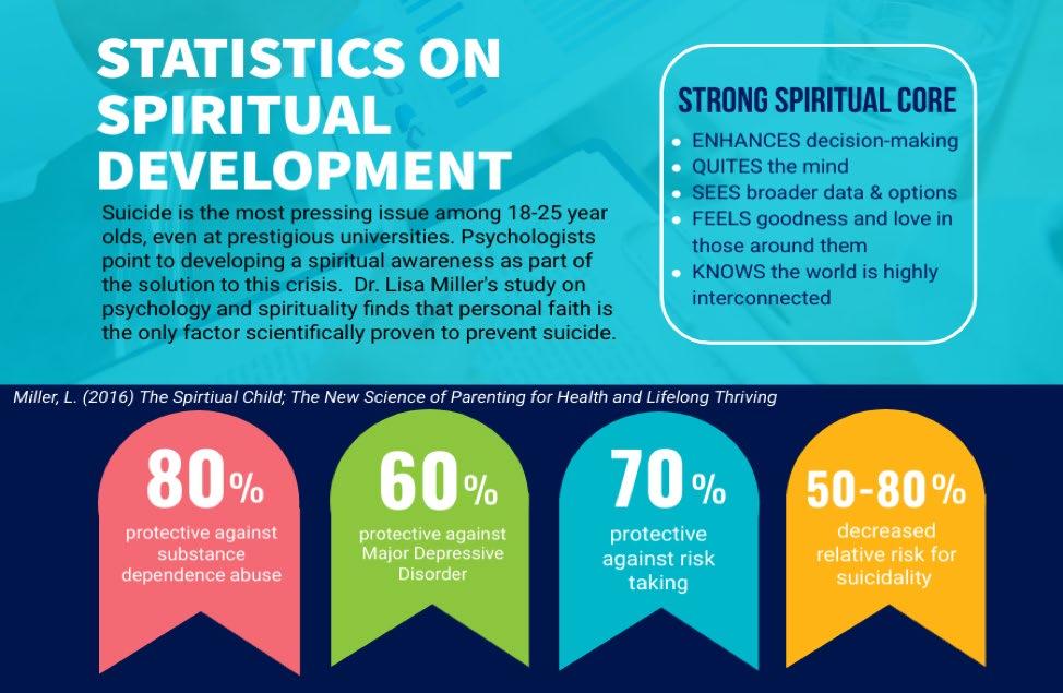 Dr. Lisa Miller, a psychoanalyst who studies the impact of spirituality on the brain, says that a life of faith should be high on the list for healing psychological crisis. In her study of the brain development of youth after experiencing trauma, she found that the quickest way to predict a child’s resiliency is to see if they have a personal faith. I have included an infographic on all her statistics so that you can see the massive difference made by a life of faith. To put these numbers in perspective, the FDA only needs a 10 percent proven viability rate to approve treatments and medication for public use. Spirituality goes way above and beyond the FDAs requirement. Spirituality is so beneficial because having a life of faith gives you a purpose and a built-in support system to live out that purpose.