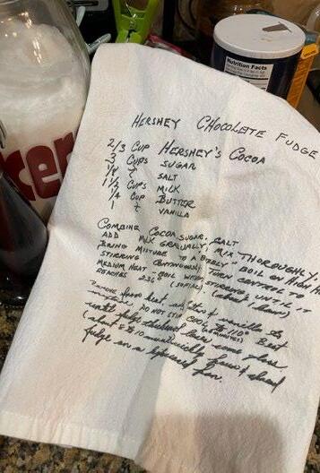written in his handwriting. She made the towel pictured to allow us to remember Dad and have a record of his fudge. We talk about making it every year, but have not tackled it yet. Maybe this year!