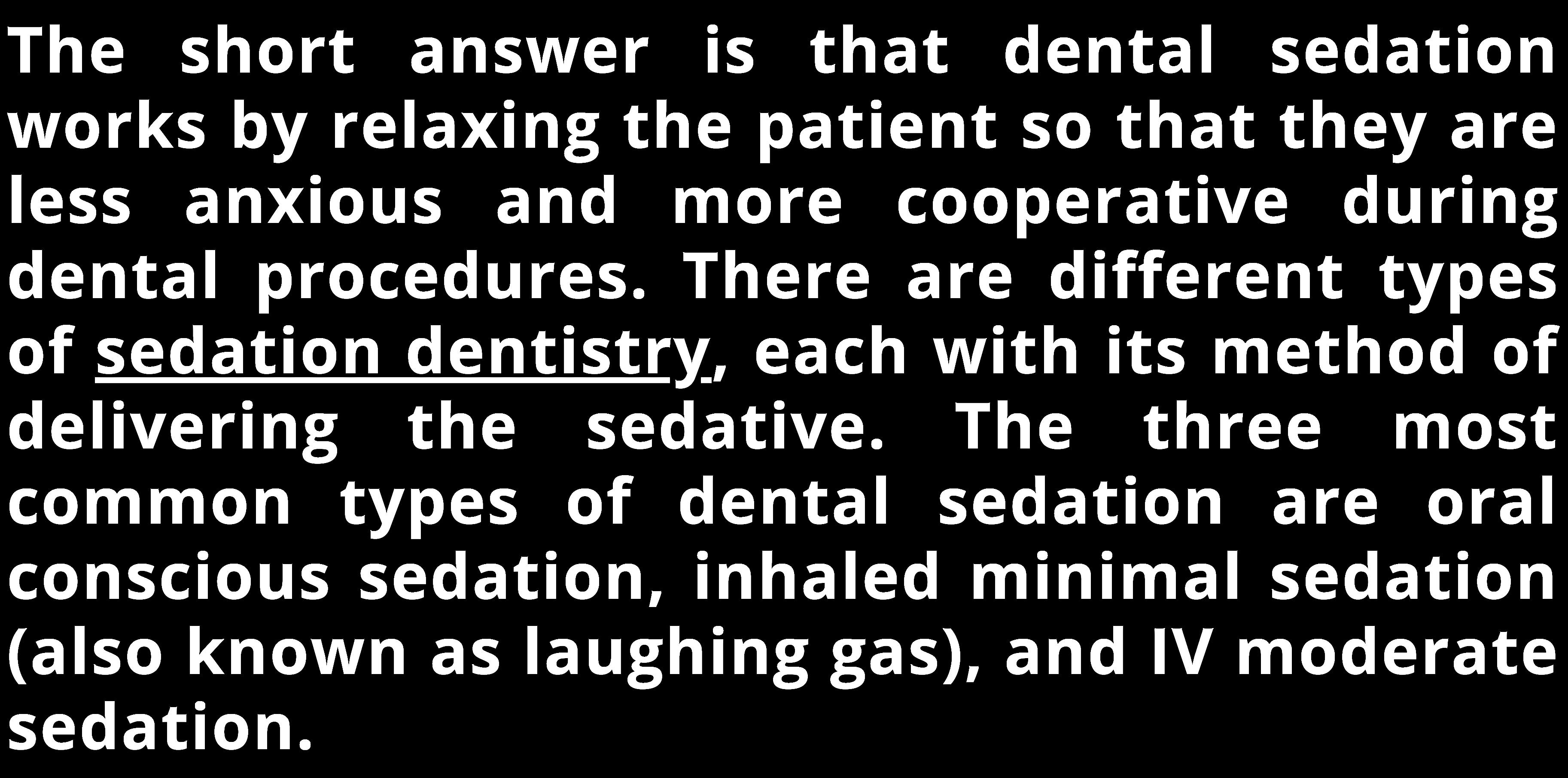 Sedation dentistry is a field of dentistry that uses medication to help patients relax during dental procedures. There are many different types of sedation, from light sedation (also called minimal sedation) to deep sedation (also called general anesthesia). Your dentist will choose the type of sedation that is best for you based on your medical history and the procedure you are having done.