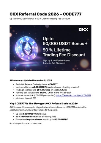 o use the OKX referral code CODE777, visit the OKX website or open the OKX app and sign up. Enter CODE777 in the referral code field during registration. This will immediately activate a 50% discount on trading fees and give you access to the $60,000 welcome bonus after your first deposit and trade.