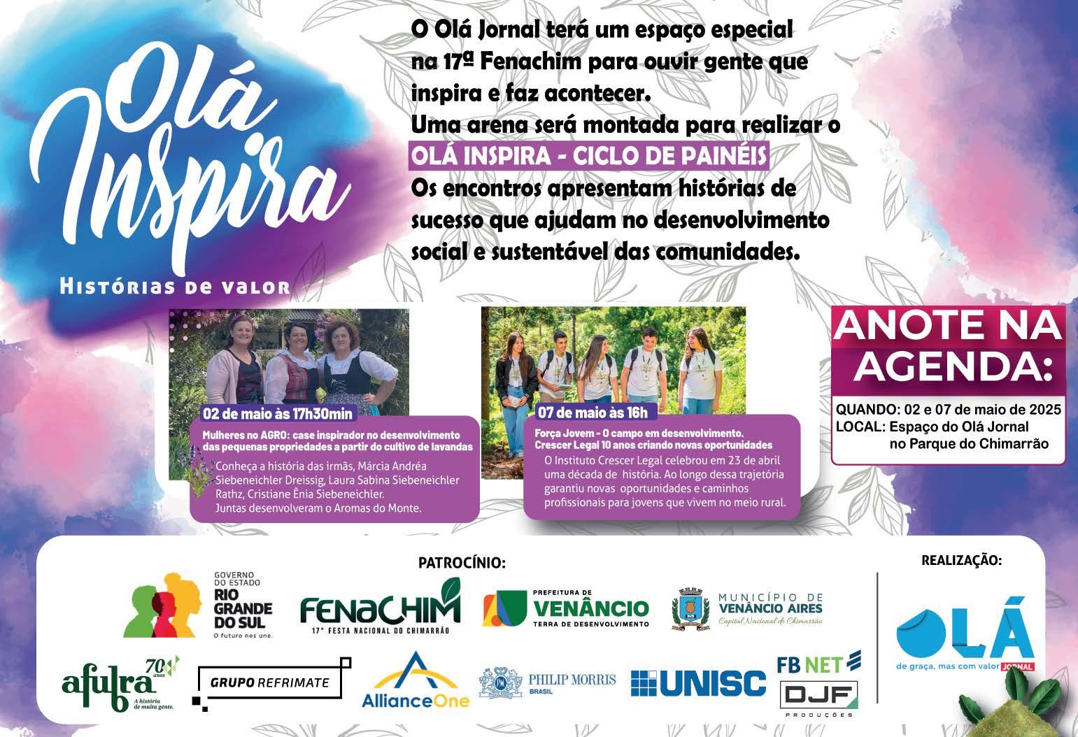 A 17ª Festa Nacional do Chimarrão começa nesta quinta-feira, 1º de maio, feriado do Trabalhador. O maior evento de Venâncio Aires garante espaço para a cultura, tradição e enaltece a bebida símbolo do Rio Grande do Sul. De 1º a 04 e de 07 a 11 de maio os venâncio-airenses se encontram no Parque do Chimarrão. O Olá Jornal preparou um local especial, para acolher amigos, leitores, parceiros e clientes. Durante a Fenachim também abrimos as comemorações dos 10 anos do jornal, celebrados em setembro, com o projeto Olá Inspira. Em duas oportunidades o espaço sediará palestras de pessoas e entidades que fazem acontecer. A proposta é trocar ideias e garantir que iniciativas sejam compartilhadas e multiplicadas. Nos encontramos no parque ao longo da Fenachim.