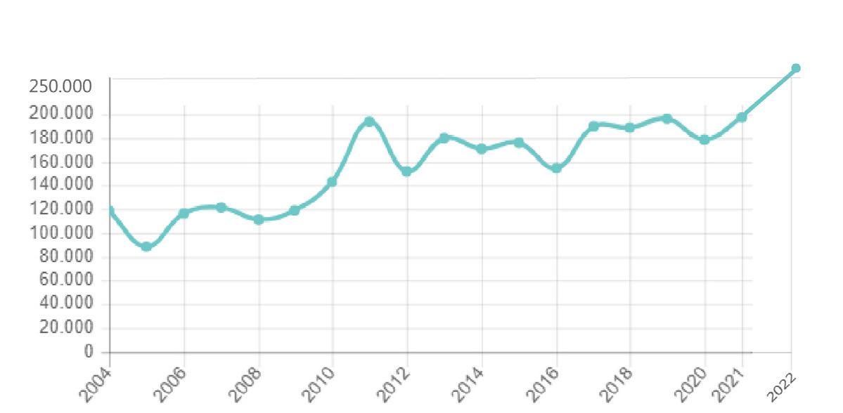 A última safra garantiu receitas re cordes para o campo por conta da demanda comercial, após o perío do de estiagem e negociação dos estoques das indústrias do tabaco. Até então, 2021 era o ano com me lhor resultado em receitas na cul tura no município, movimentando R$ 198 milhões. As receitas obtidas com a cultura também estão em uma crescente ao longo dos últi mos 18 anos.