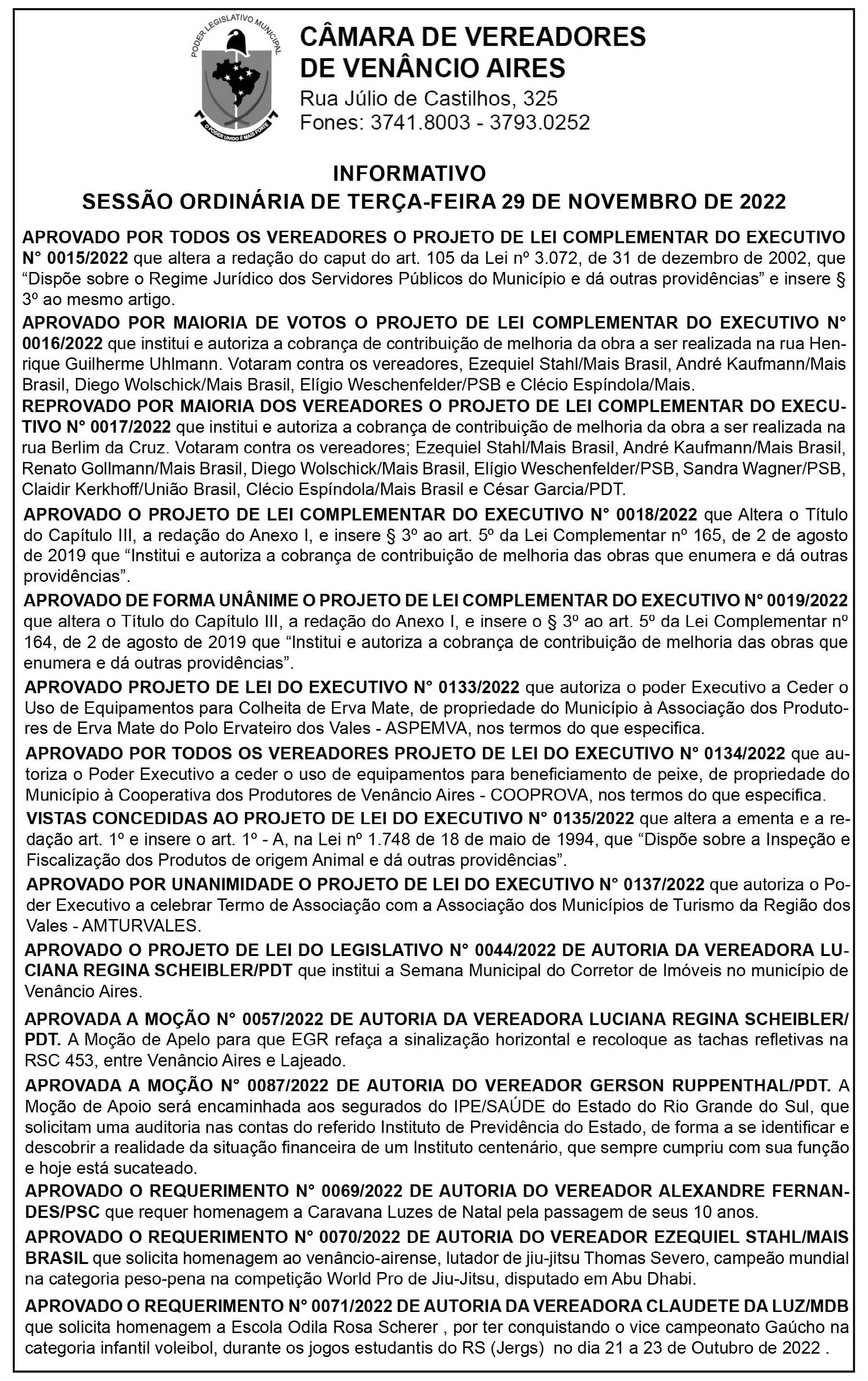 “O Poder Legislativo consultou a população durante todo o evento da Fenachim – festa realizada no Município e que, a partir da pes quisa realizada, constatou-se que 92,85% da população é favorável que o feriado do dia do Município retorne para o dia 11 de maio. Des taca-se, ainda, que foi realizado nesta Casa uma consulta popular, através de uma audiência pública, no dia 30 de setembro de 2022, para tratar sobre o retorno do fe