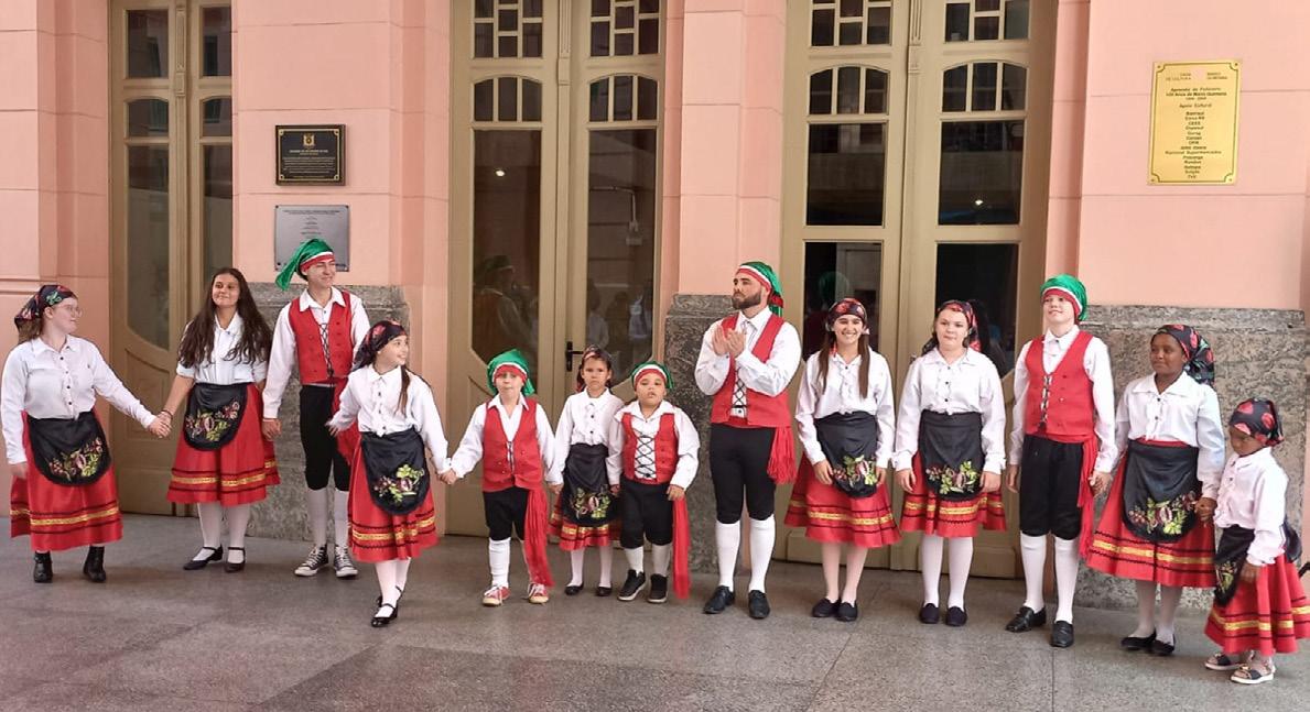 O Grupo de danças folclóricas açorianas Resgatando Nossas Raí zes, de Venâncio Aires integrou as programações da 1ª Conferência dos Municípios Luso Brasileiros do Rio Grande do Sul, no último sábado, 26. As atividades foram realizadas na Casa de Cultura Ma rio Quintana em Porto Alegre. A programação envolveu grupos culturais, escolas e municípios que tiveram colonização portu guesa. Além disso, gastronomia típica e artesanato fizeram parte das programações. O grupo de danças de Venâncio Aires integra o Núcleo Luso-Açoriano do mu nicípio, mantido pela Associação dos Amigos do Centro Municipal de Cultura (Acemuc). As apresen tações iniciam em 2018. O Grupo traz as danças vindas dos Açores, e presta homenagem