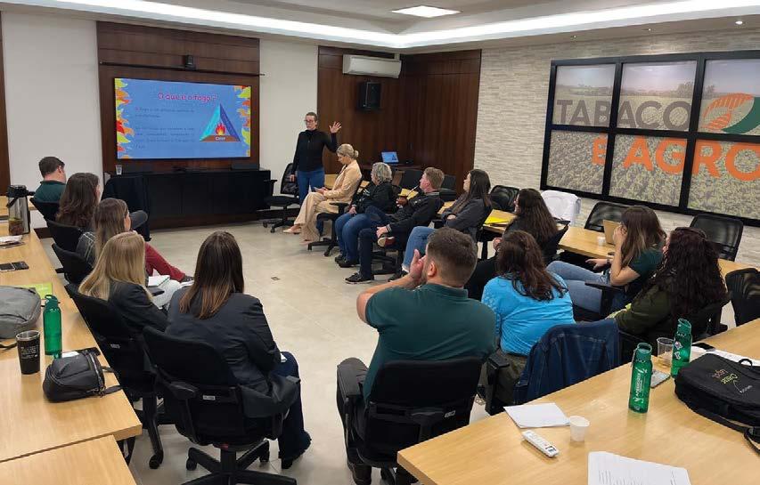 vertente educacional, com atividades realizadas junto ao Instituto Crescer Legal para qualificar educadores e jovens aprendizes em prevenção de incêndios e primeiros socorros. “Esses conhecimentos irão beneficiar o ambiente de trabalho e as comunidades rurais que fazem parte da cadeia produtiva do tabaco,” comenta Santos. A parceria com o Instituto permite que as ações de segurança alcancem famílias e jovens no campo, ampliando a rede de apoio em caso de necessidade. O PAM também já conduziu treinamentos em conjunto com a Bequisa, fornecedora de produtos químicos, para aprimorar o manuseio seguro e