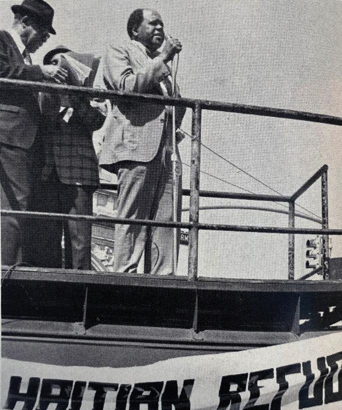 1199 VP, David White, addresses a Brooklyn rally against plans to deport several hundred Haitians living in New York in 1974.