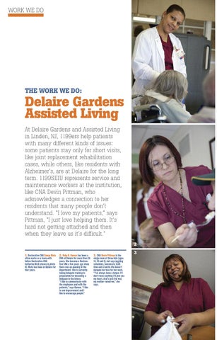 At Delaire Gardens and Assisted Living in Linden, NJ, 1199ers help patients with many different kinds of issues: some patients stay only for short visits, like joint replacement rehabilitation cases, while others, like residents with Alzheimer’s, are at Delaire for the long term. 1199SEIU represents service and maintenance workers at the institution, like CNA Devin Pittman, who acknowledges a connection to her residents that many people don’t understand. “I love my patients,” says Pittman, “I just love helping them. It’s hard not getting attached and then when they leave us it’s difficult.” 2 1. Restorative CNA Danny Mota often works as a team with fellow Restorative CNA Catherine Bird (shown in photo 8). Mota has been at Delaire for four years.