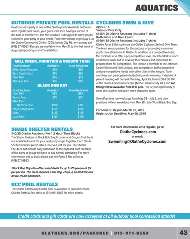 Credit cards and gift cards are now accepted at all outdoor pool concession stands! O L AT H E K S . O R G / PA R K S R E C | 9 1 3 - 9 71- 8 5 6 3