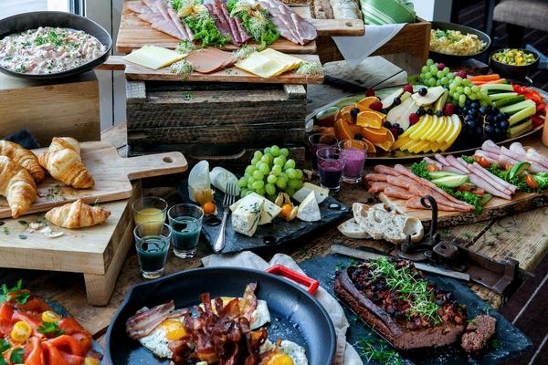Sélectiondecaféetdethé,yaourtavecunevariétédegarnitures, céréalesetsuperaliments,jusdefruitsfraisetsmoothies,fruitset viennoiseries.