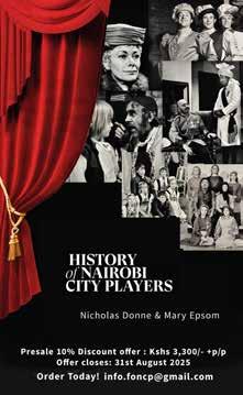 A collective effort from a small production team has now meant that a book has been launched in July this year and is entitled History of Nairobi City Players . This book consists of over 100 pages and has been compiled from various documents including theatrical programmes, photographs, newspaper articles and reviews, as well as from some personal recollections of several participants in the various shows staged by the group from 1956 to 2014. This anthology adds to the rich theatrical history of Kenya. A limited number of copies have been printed and these are currently available by contacting Nick Donne at info.foncp@ gmail.com. The net price for the book is Kshs 3,500 but NCP is offering these for sale to readers of the Old Africa Magazine at an initial discounted price of Kshs 3,200 (excluding P&P) for purchases made before 31st August this year.