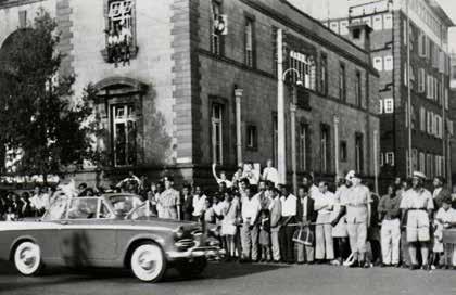 3. Crowds gather to watch the motorcade accompanying Princess Margaret on her visit to Nairobi in 1956.