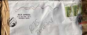 One of many envelopes we have received at our Naivasha post box with Old Africa magazine inside marked RTS, Return to Sender, in this case from the post office of a reader in Australia who is now deceased.