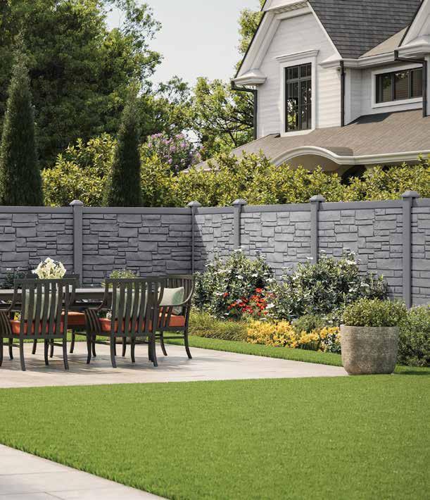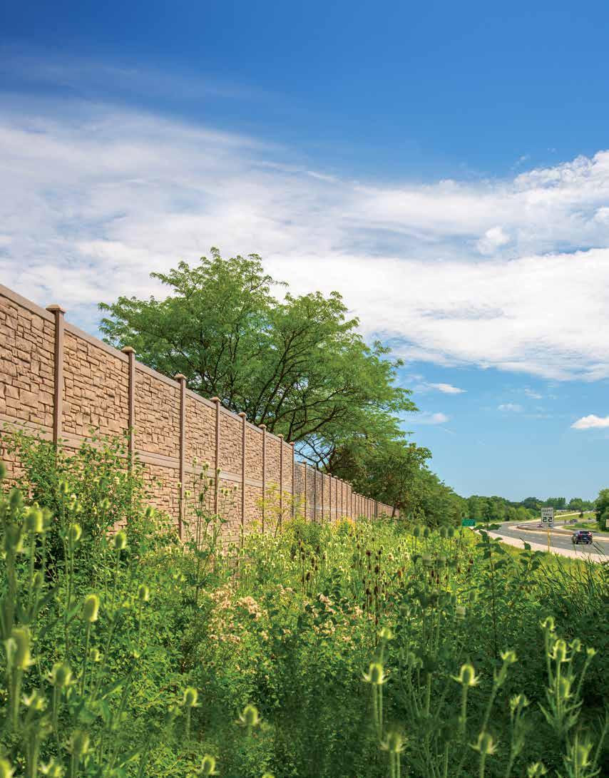 The look and feel of real stone and wood in steel-reinforced polyethylene. Commercial quality barrier reduces noise and buffers high winds. Its easy-clean surface releases graffiti with a high-pressure washer.