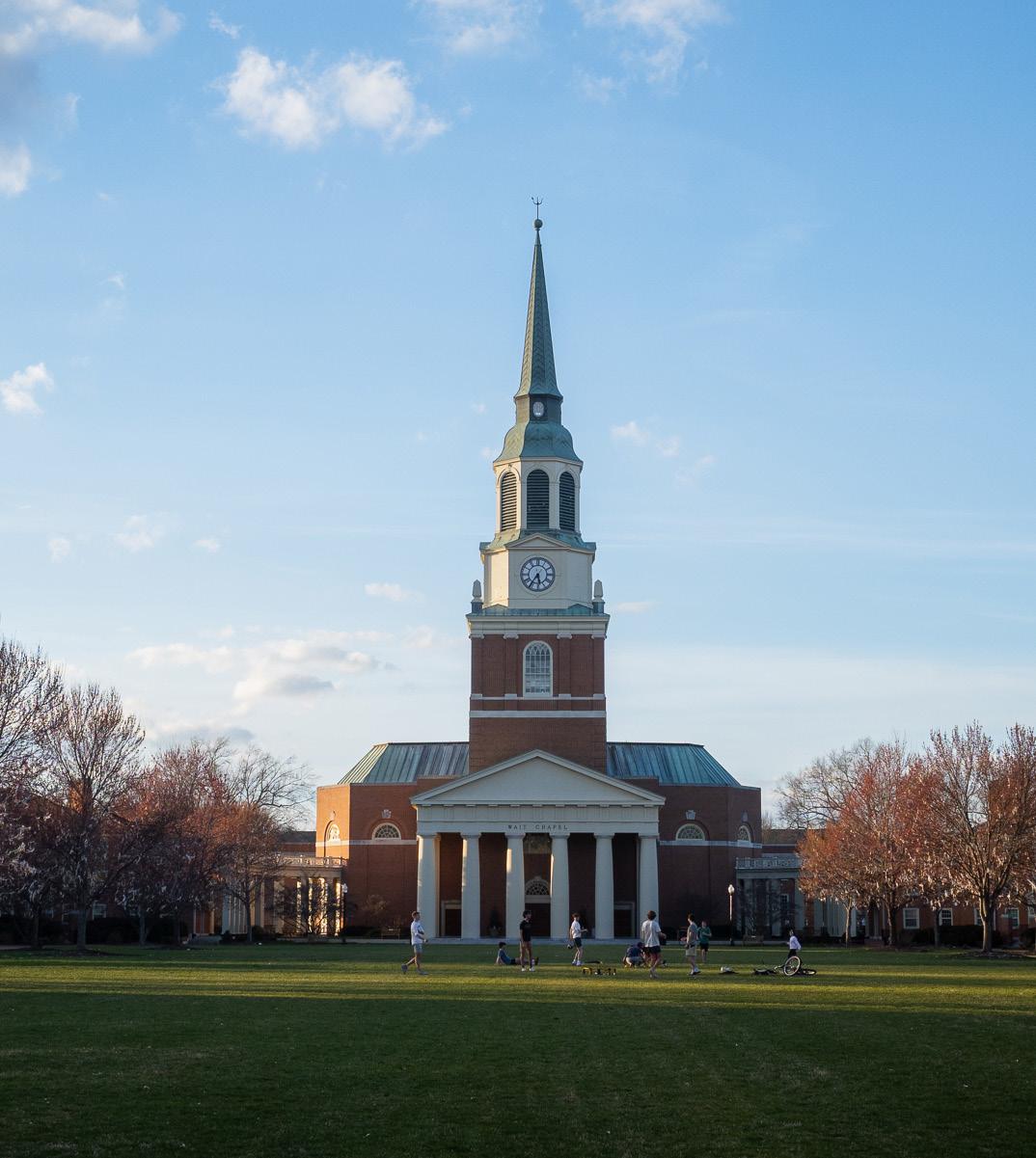 For me, this looks like leading the Old Gold & Black, participating in an a capella group and volunteering at a local middle school. While each of my commitments is vastly di erent from the other, they encourage me to be a well-rounded individual who is invested in both Wake Forest and WinstonSalem. I hope you challenge yourself this year to know your community both on and o campus. Welcome to Wake Forest, and I wish you all the best.
