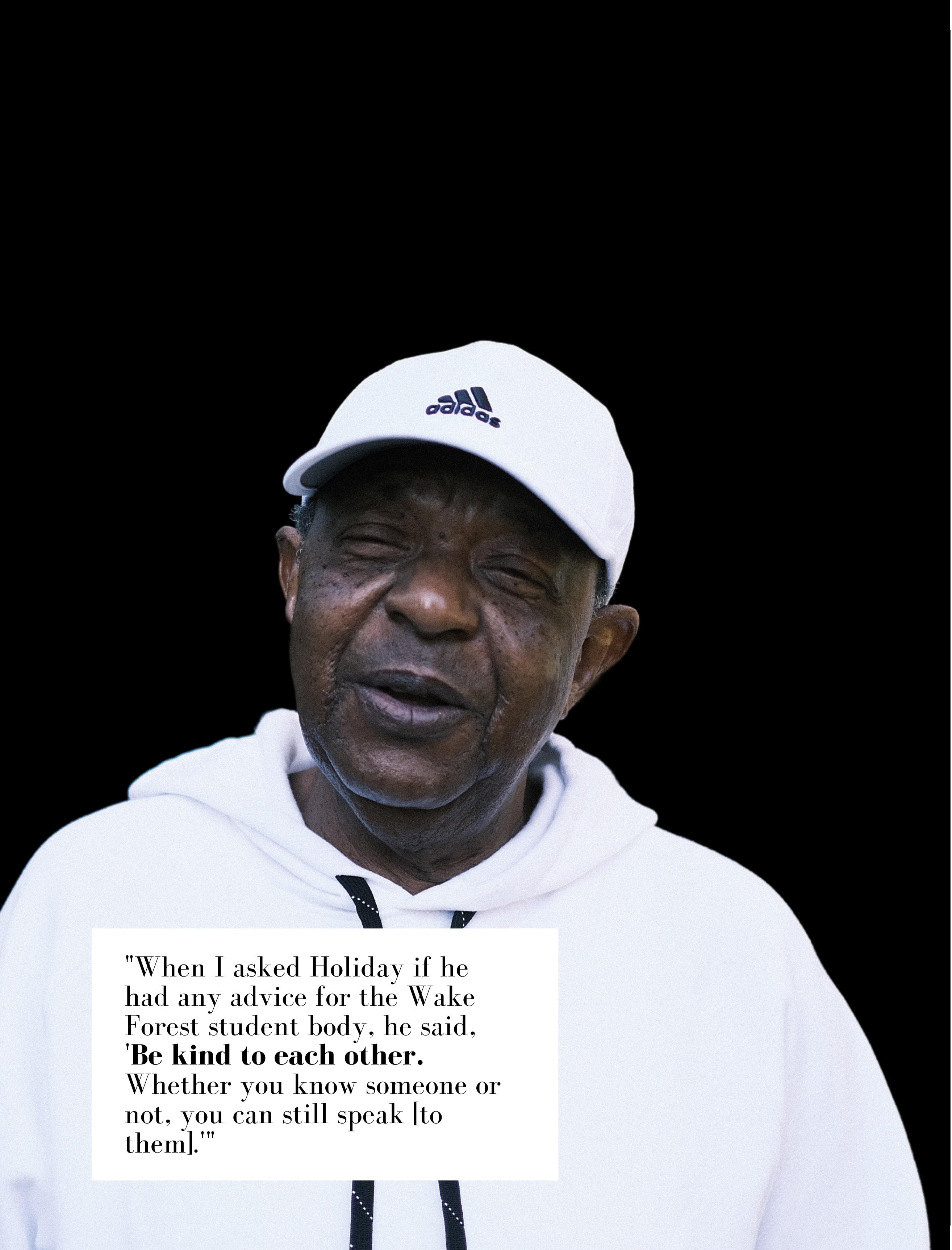 When I asked Holiday if he had any advice for the Wake Forest student body, he said, “Be kind to each other. Whether you know someone or not, you can still speak [to them].” Indeed, that’s exactly the kind of person Hol iday is — somebody who’s constantly looking to brighten someone else’s day through conversation and compan ionship, even if that person is a com plete stranger.