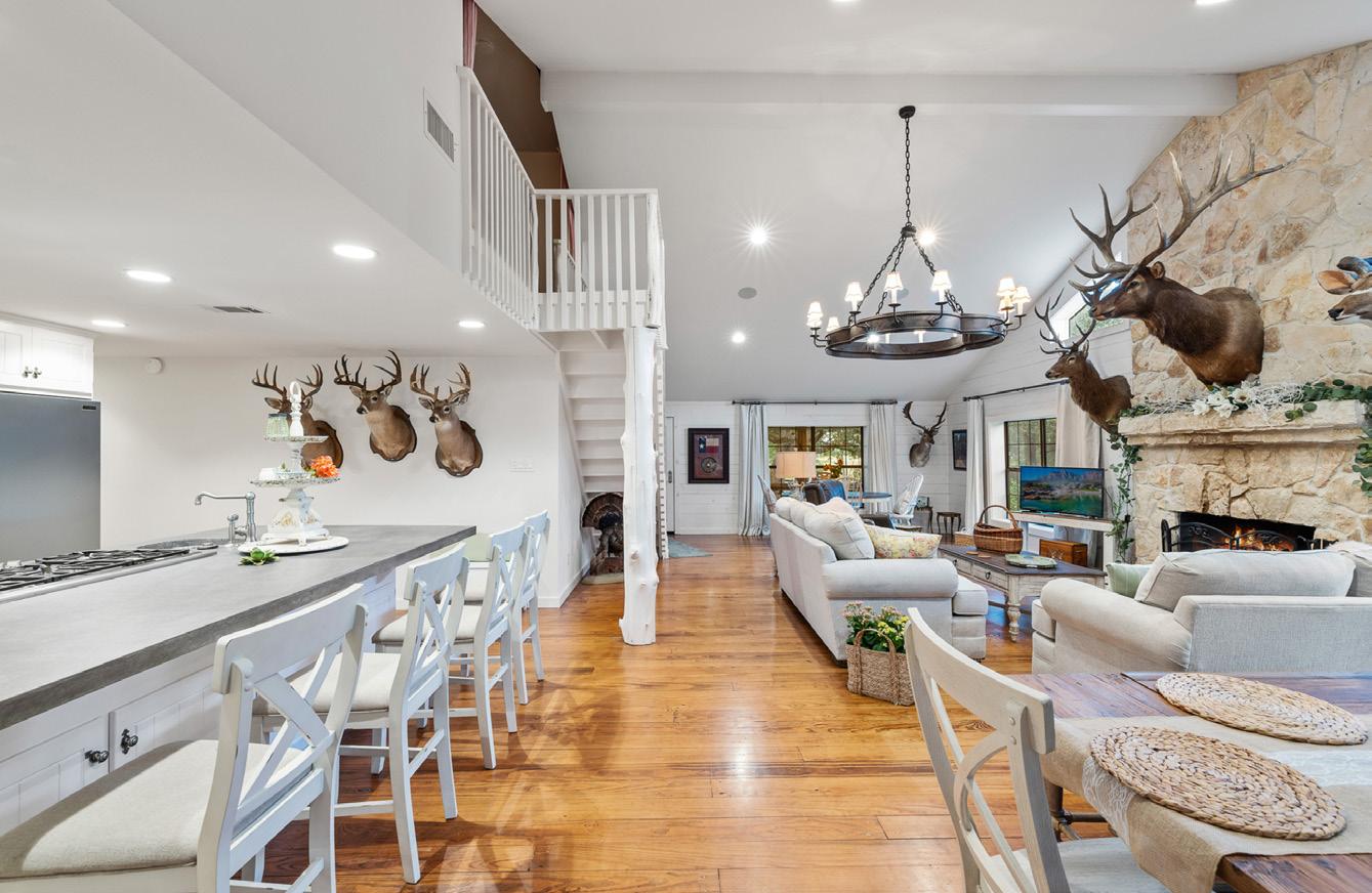 Nestled under the shade of 100-year-old live oaks, this serene weekend getaway offers a perfect blend of relaxation and recreation just five minutes south of Columbus, Texas, and only 75 miles from downtown Houston. The property features a spring-fed, stocked pond with a pier, ideal for peaceful afternoons by the water. The 2,240-square-foot main house and 2,480-square-foot guesthouse, with a large game room, provide comfortable accommodations, while the outdoor swimming pool, firepit, and shooting range offer endless entertainment. A two-stall horse barn, 2,400-squarefoot metal barn with living quarters, and rolling terrain dotted with live oaks and open pasture create the ideal retreat for nature enthusiasts. Wildlife abounds with whitetail deer, ducks, dove, and hogs, making this property a true outdoorsman’s paradise.