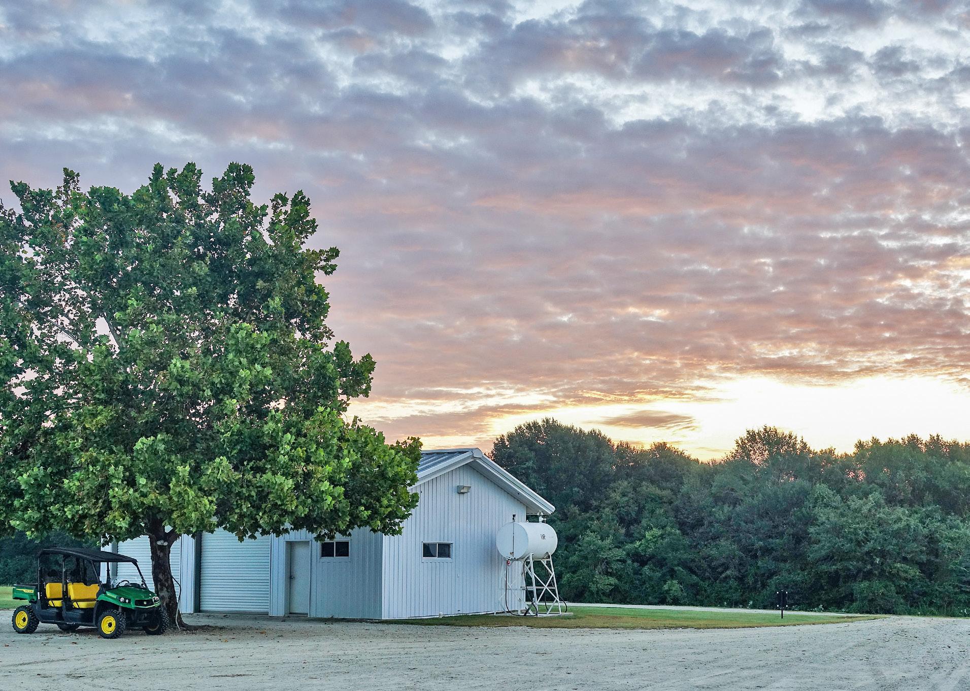 Before leaving the residence compound, we pass the five-bay garage, yet another feature that delivers more than one would expect at first glance. The side door leads us into a free-span space devoid of interior columns with an automatic light sensor. The walls and ceiling are insulated and equipped with ample broad-spectrum lighting. The air is gently moved by a line of low-profile industrial fans running the length of the building. And, of course, each of the five roll-up garage doors is powered with independent commercial-grade electronic door openers.