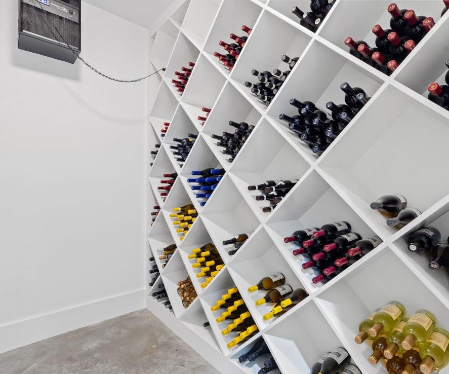 We now head back to the hallway; one could easily assume that the tour of the primary residence was done. However, a metallic button on the wall adjacent to a door leads us to a three-person elevator. We enter, close the door, slide the elevator door, and take a smooth, brief journey to the basement. Upon exiting the elevator, we come first to a short three-way hallway. The door reveals a temperature-controlled wine cellar with ample storage and climate controls. From the wine storage, we head further into the basement, where a room opens up in an expanse with two rows of seating facing a wall. We enter the theater. With a state-of-the-art digital projector integrated into the smart home electronics, one can connect, display, and enjoy games or movies with guests. Before heading back up, we will access and visit the panic room. A room with reinforced doors, fire-resistant walls, and secured data connections provides peace of mind space for events unknown and remaining true to the spirit of self-reliance. Emerging from the basement, we head next to the pool house. The beautifully maintained zoysia grass is tera-scaped into steps, giving the feel of a Zen Garden in grass form. The pool, shaded seating