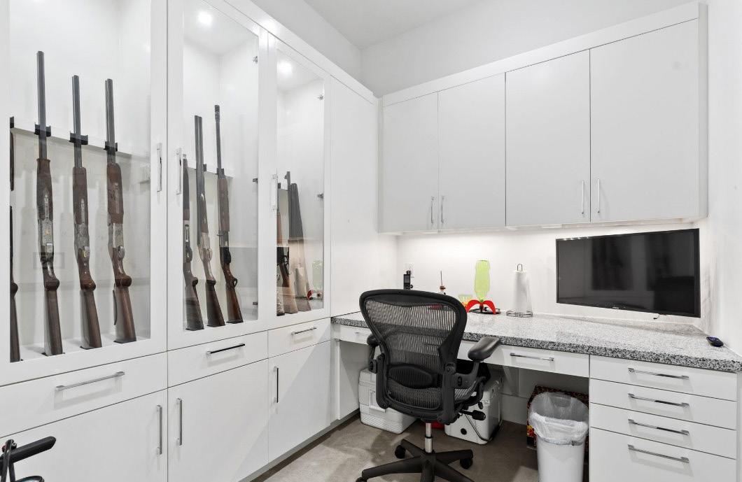 Continuing forward into the house, we encounter another room to the right. The space is clean and efficient; the door is heavy and robust, clearly reinforced, and used as a gun closet and loading room, perfect for securely storing firearms and maintaining secured data access for the residences. Next, we enter the expansive center of the house.