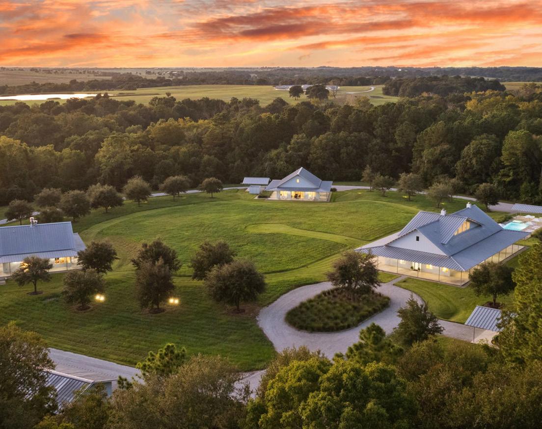 From County Road 305, one turns south onto Whitehall Ranch’s private road. Driving south past the stunning view of perfect pastures, barns, stables, lakes, and expansive stands of mature trees. Upon final approach to Tract 5A, the road dips, and you cross a spring-fed creek. From there, another ½ mile drive, and to your left, you see a private gated entrance leading us down a private secluded road into the residence compound. Pulling in to the left a five-bay insulated garage, and to the center, a ring of structures, four in all. The guest cottage, the bunkhouse, the pool house, and the primary residence are all situated in a circle facing one another within a 75-yard oasis of nature. The center point is marked by a freshly cut zoysia grass path tied to illuminated live oak trees. The topography is gently elevated in the center, providing a perfect amount of privacy between the structures and maintaining a balance of intimacy by proximity without betraying each other’s privacy.