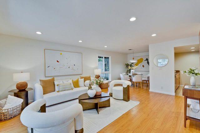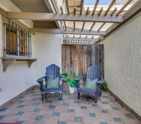 Welcome to this two-story townhome featuring 2 bedrooms and 1 5 bathrooms in the desirable Casa De Anza community Enter through a private front yard into a hallway with a gourmet kitchen on the left, showcasing granite countertops, stainless steel appliances, and ample white cabinetry The kitchen flows into a dining area and spacious living room with a cozy fireplace and recessed lighting throughout A sliding door opens to a private backyardperfect for indoor-outdoor living. A convenient half bath and in-unit washer and dryer are located on the right side of the hallway. Upstairs, the primary bedroom boasts two closets (including a walk-in) and access to a private balcony. The second bedroom is spacious and front-facing. The full bathroom features two granite vanities and a shower over tub. Additional highlights include a detached 1-car garage, 1 reserved parking space, and ample visitor parking. Enjoy community amenities such as a clubhouse, tennis court, swimming pool, and playground. Located near Cupertinos restaurants, shopping, and groceries, with easy access to Hwy 85 and
