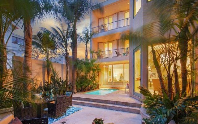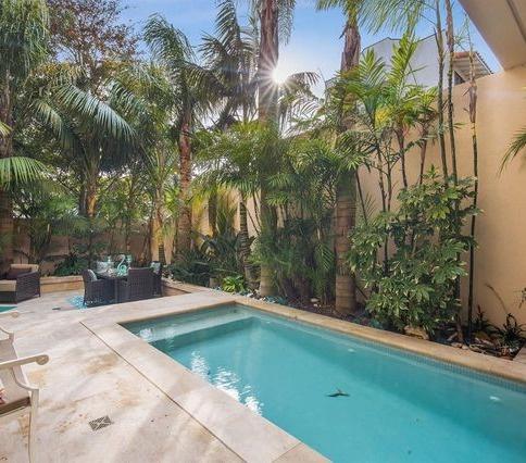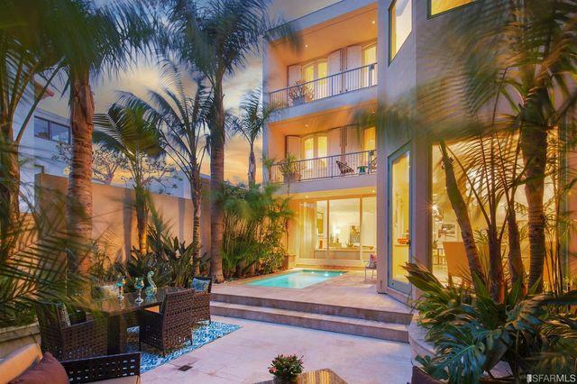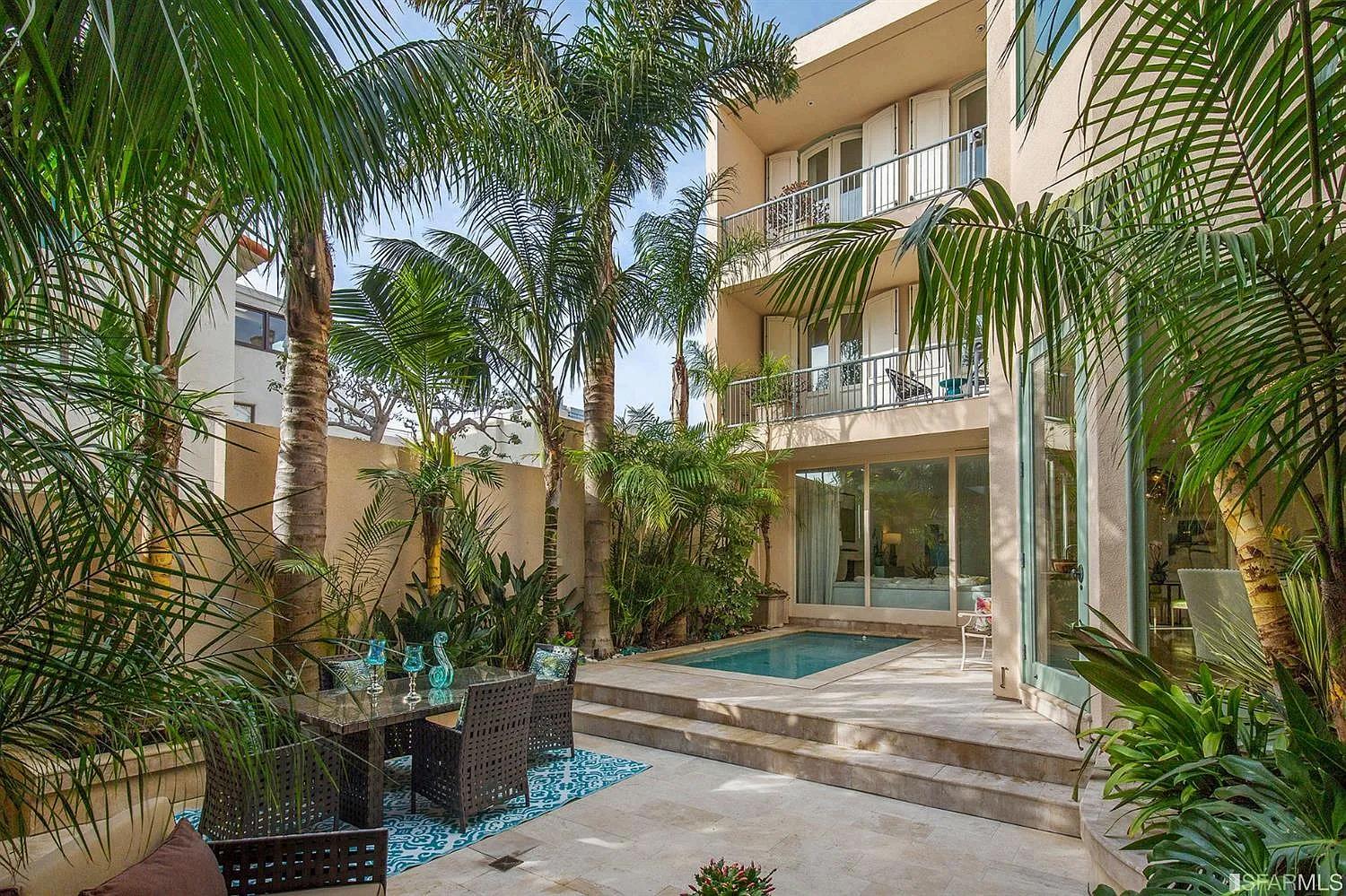 Beyond the doors, a south-facing tropical retreat reveals the home’s defining feature: a heated swimming pool surrounded by palms and stone walls, creating a rare resort-like setting in the heart of San Francisco.