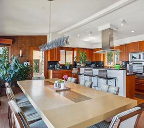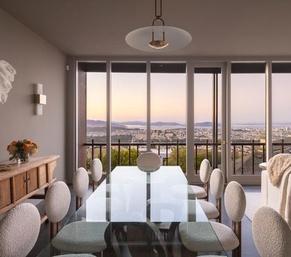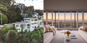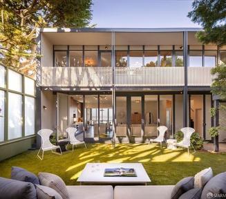 Extensively renovated in 2022, 180 Palo Alto is perched atop Twin Peaks and captures sweeping views of San Francisco's skyline, the Golden Gate Bridge, and the Bay. Designed in 1958 by Campbell & Wong Associates, 180 Palo Alto stands as an enduring example of Northern California midcentury modernism. The firm, celebrated for sculptural forms and an exceptional command of light, was integral to the Case Study House movement (CSH #27) that shaped American modern architecture from the 1940s to the 1960s Their vision here is expressed in pure form: a striking glass facade, fluid interior spaces, and an effortless connection between home, garden, and view A discreet entry gate leads to a terraced garden, where the house reveals its defining geometry Inside, walls of glass flood the interiors with light, while four sets of French doors dissolve boundaries between indoors and out The kitchen and family room are anchored by a marble-topped island and top-tier appliances, extending to dining and living areas with a balcony spanning the length of the home. The primary suite commands the Continued on next page