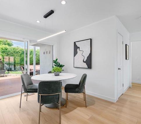 Experience comfortable living in this beautifully remodeled three-bedroom, two-bath, single-level home with a spacious backyard in San Mateo Village It combines modern upgrades with timeless style and is just a short distance from the CalTrain Station As you step inside, you ' re greeted by a warm and inviting ambiance The spacious open-plan living area is perfect for relaxing or entertaining guests and features a cozy fireplace Adjacent to the living area, the dining space flows seamlessly into the stunning kitchenideal for the culinary enthusiast. The kitchen has Caesarstone countertops, a glass-top electric oven, a stainless steel vent hood, a refrigerator, a dishwasher, and a garbage disposal. Each generously sized bedroom provides a peaceful retreat, with the master suite boasting a luxurious ensuite bathroom and ample closet space for convenience and comfort. Step outside to a private backyard oasis, perfect for outdoor dining, barbecues, or soaking up the California sunshine. The hardscaped backyard offers low-maintenance beauty and a separate structure in the yard The