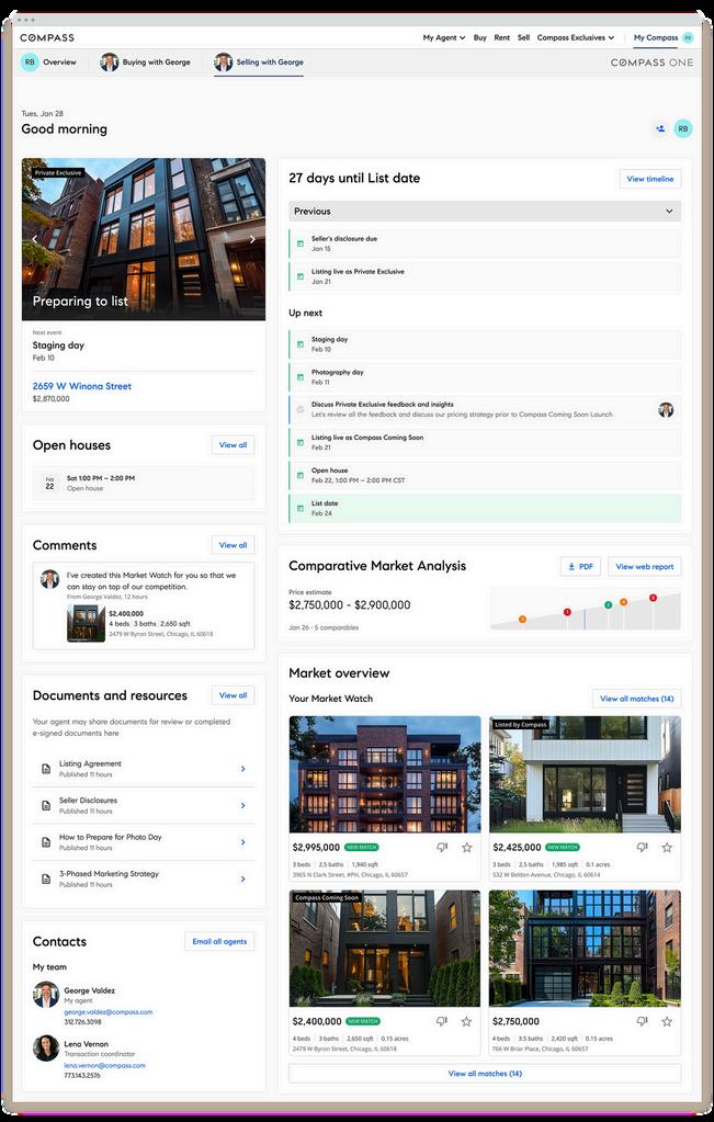 AtCompass, the technology of the future is already shaping real estate today. We’ve invested over $1 billion in our technology platform to help agents make buying or selling a home easier for you. This includes Compass One, an all-in-one client dashboard that enhances transparency and keeps you connected with your agent at every step of your journey.