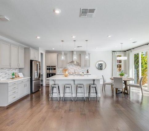 Unparalleled customization and luxury emanate from this gorgeous, nearly 3,000sqft home on an oversized lot The landscaped front yard makes way to the covered porch with Ring doorbell and to magnificence inside Elegant flooring runs throughout, including into the downstairs suite with Tonal exercise machine Next is the half bath and dining room The hallway opens to the chef's kitchen touting an incredible single-slab island, slow-close custom cabinetry, and Wolf, Sub-Zero, and Vent-a-Hood appliances. It's open to the family room with oversized windows and gas fireplace surrounded by custom tile. Carpeted stairs take you to a second cozy family room, two guest rooms, custom laundry room with sink and beverage fridge, full bath with double-sink vanity, and the primary suite. Here you'll lose yourself to the comfort of tall ceilings, view-filled windows, soaking tub, and custom walk-in closet. The entertainer's backyard includes a patio, artificial lawn, privacy wall, garden space, and relaxing hot tub. Additional amenities include dimmable recessed lighting, dualzone A/C with Nest