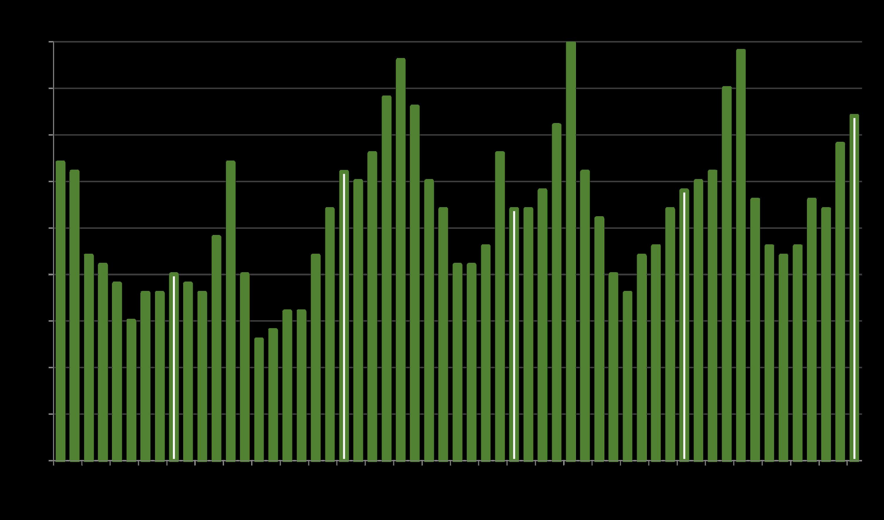 Per https://fred.stlouisfed.org/series/NASDAQCOM. Because of number of data points, not every week has a separate column. Data from sources deemed reliable but may contain errors and subject to revision. For general illustration purposes only.