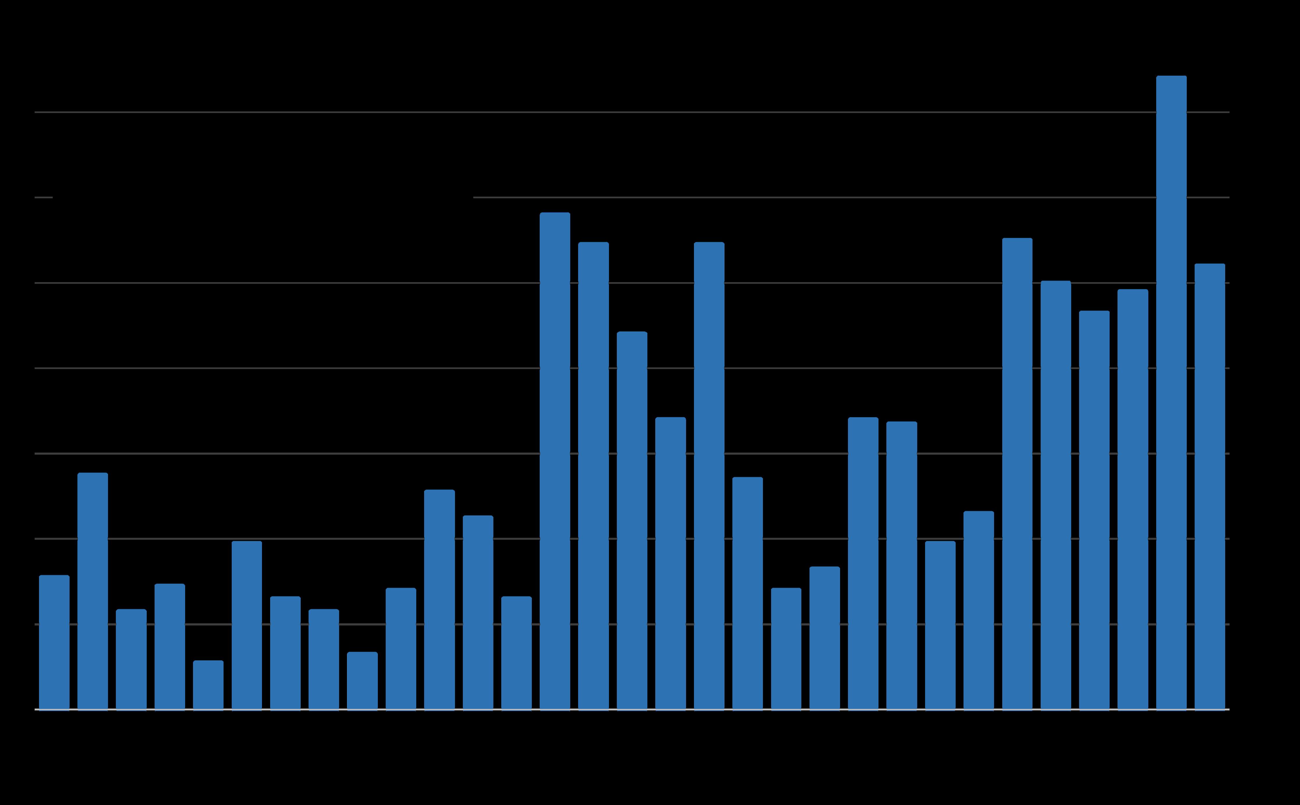 2025 continued to decline from the June high, but was 8% higher year over year. The very large monthly y-o-y increases seen earlier in 2025 have been rapidly falling.