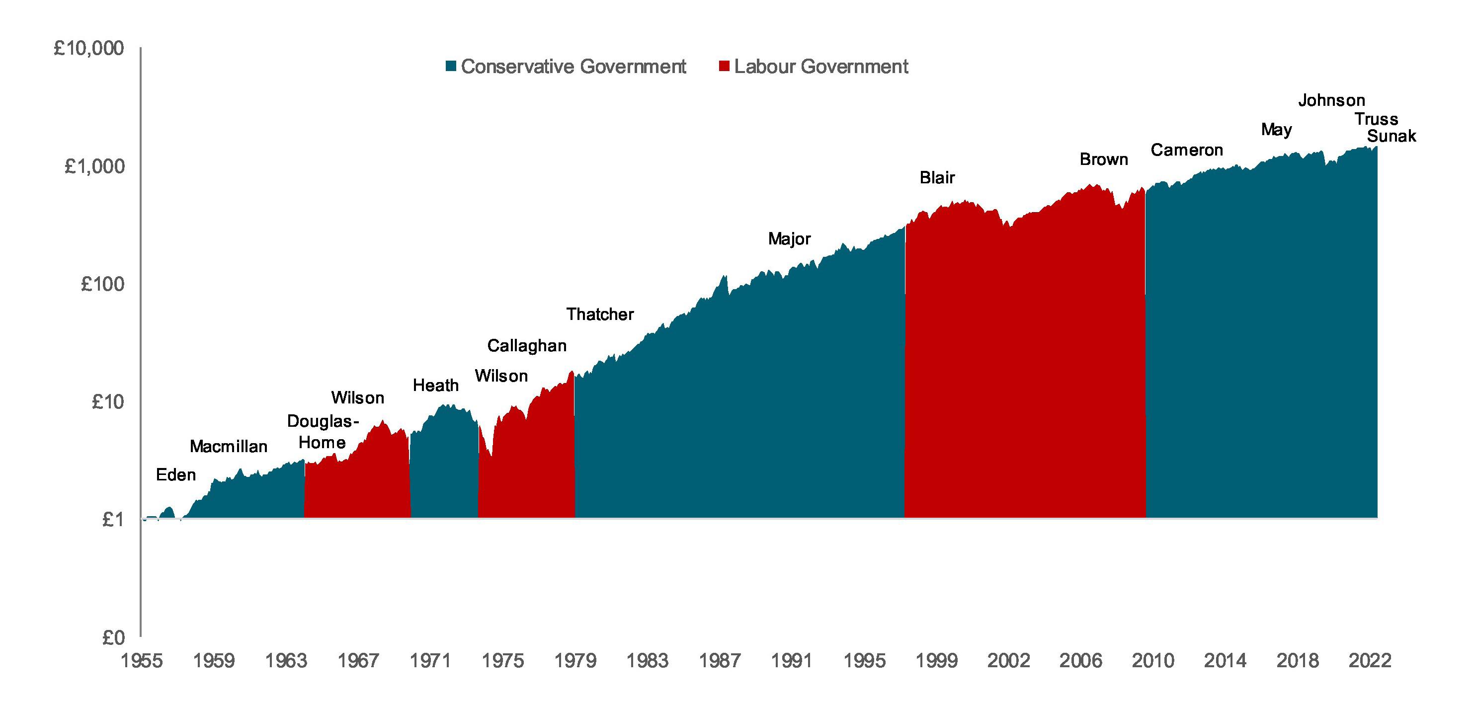 Predictions about the impact of the election outcome on the stock market tends to focus on which party will be ’better for the market’ over the long run. The graph below shows the growth of £1 invested in the UK market over almost 70 years and 16 prime ministers (from Anthony Eden to Rishi Sunak).