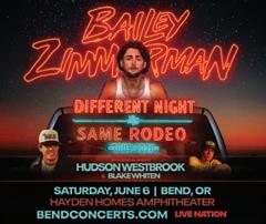 Get ready, Bend! Bailey Zimmerman brings his gritty, rock-tinged country storytelling to town on Saturday, June 6, 2026. We can expect a set packed with sing-at-the-top-of-your-lungs hits like “Fall in Love,” “Rock and a Hard Place,” and “Religiously,” plus fan favorites from his debut album. His live show leans into that gravelly, heart-on-sleeve vocal and big-hook energy that turns breakup ballads into arena anthems. Plus, rising country newcomers Hudson Westbrook and Blake Whiten will open the night with sets sure to prime the crowd with fresh, buzzed-about tracks.