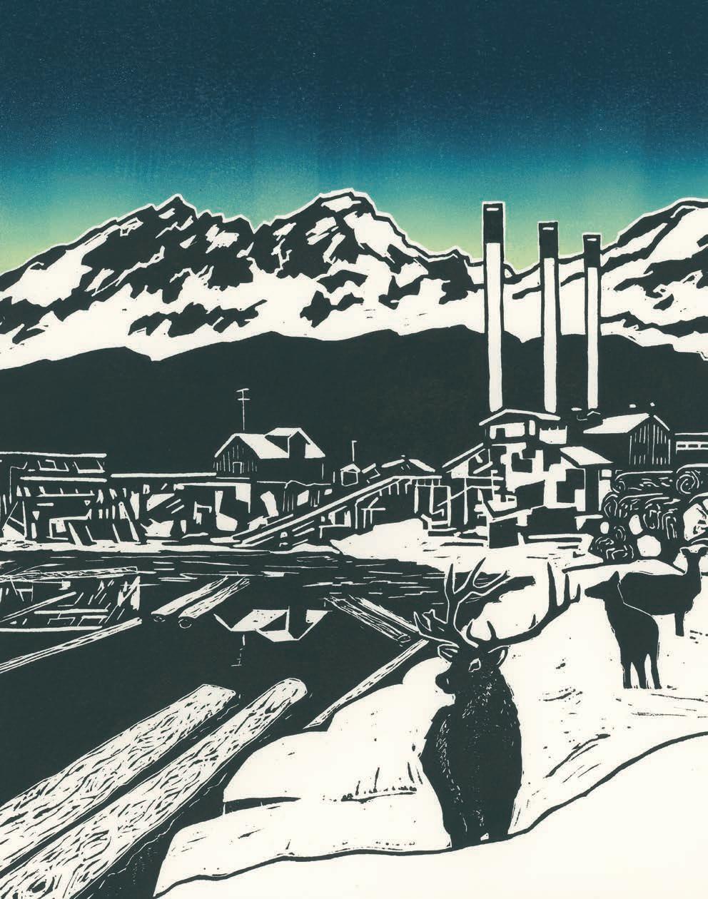Finally, we’re thrilled to share with the world our 2025 Winter Art Series piece from Bend artist Jennifer McCaffrey that serves as the cover of this year’s Guide. Best known for her oil paintings, McCaffrey created a magical scene using linocut techniques that pay homage to the Old Mill District’s industrial roots.