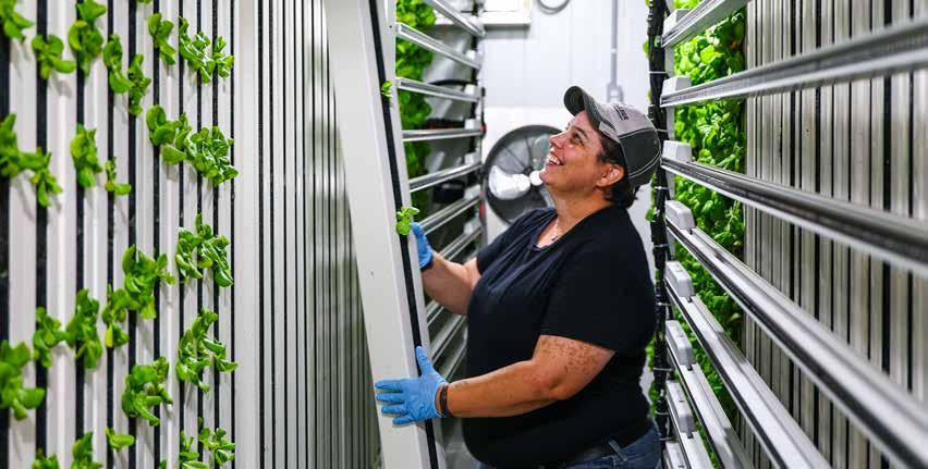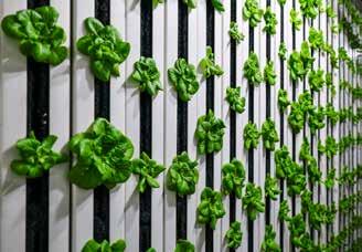 The vertical hydroponic farming system uses nutrient-rich water, LED lights and a vertical tower eight feet (8’) tall to grow plants. The lights are customized and provide intercanopy illumination for specific types of growth and timed to operate off-peak energy consumption periods to maximize energy efficiency. The crop is grown in 240 eight-foot-tall, tubeshaped hydroponic towers, which can also be modified in warehouse-sized facilities and greenhouses. This closed system efficiently dispenses a nutrient-rich water mixture to over 3,800 plant sites, eliminating the need for soil and maximizing space.