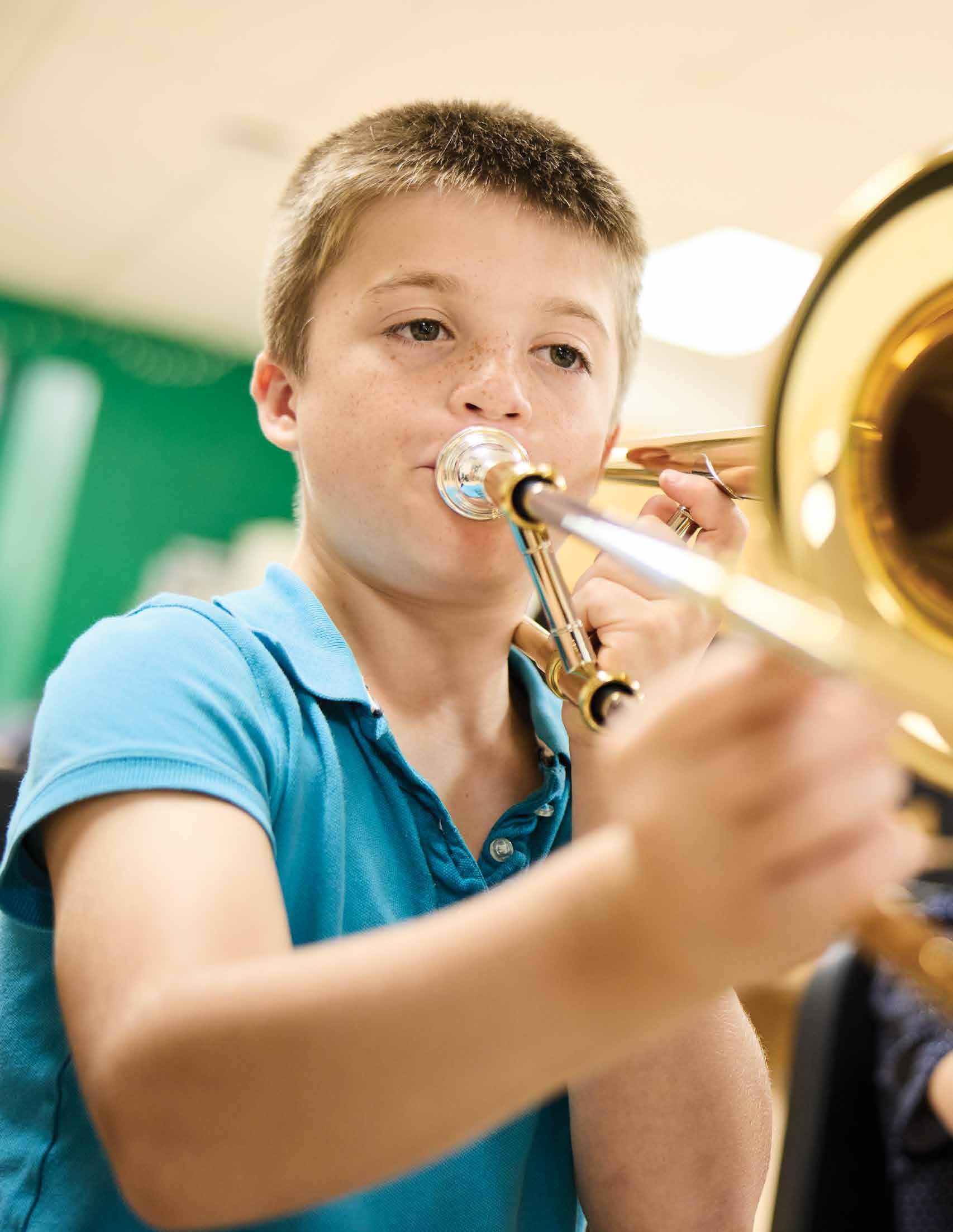 Fifth grader Neko Zufall ’28 learns the fundamentals of trombone in band class.