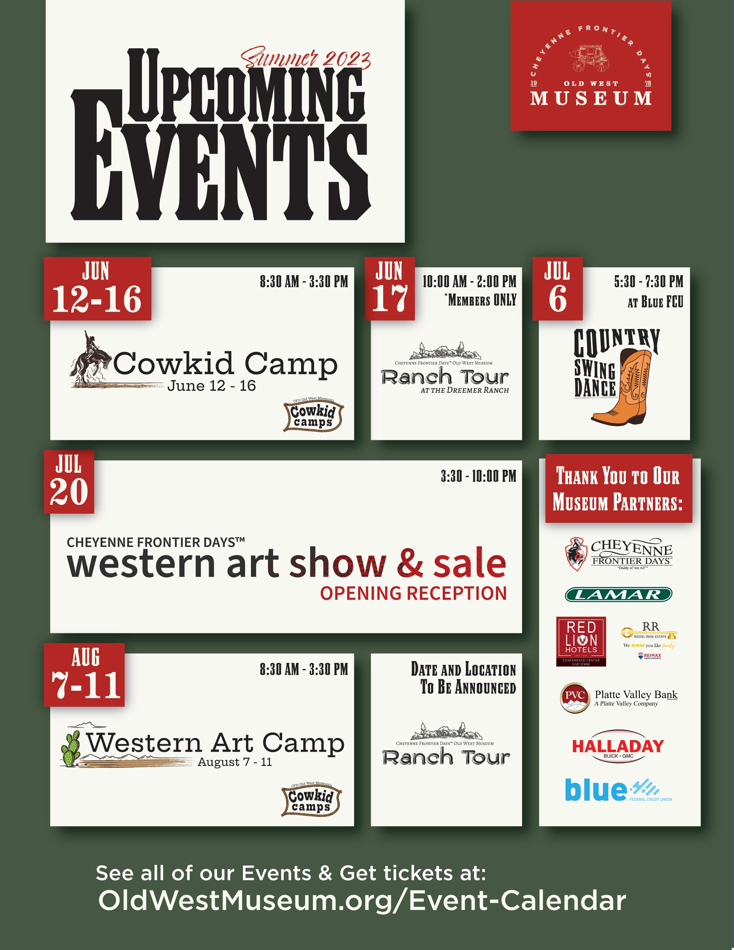 8 Upcoming Events Spring 2023 5:30-7:30 PM Carriage Hall wi Art UNCORK’D Melissa Cullen FEB 9 5:30-7:30 PM Carriage Hall wi Art UNCORK’D Diane Edwards APR 20 6:00 PM Carriage Hall MAR 11 Opening Reception 6:00-8:00 PM Carriage Hall MAR 23 MAY 19 MURDER MYSTERY DINNER in the Bathtub 5:30 PM Red Lion Hotel & Conference Center Museum Partners: Thank You to Our CONFERENCE CENTER CHEYENNE RED LI N HOTELS See all of our Events & Get tickets at: OldWestMuseum.org/Event-Calendar