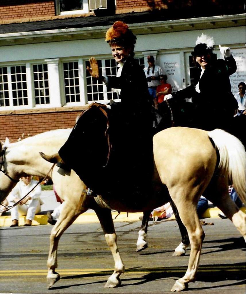 Mary Hartman’s involvement with Cheyenne Frontier Days™ began in the late 1970s with attending rodeos and riding in the parades. One of her neighbors in Iron Mountain, Wyoming was Carol Farthing, who was a seamstress, designing historically inspired outfits for the W-HEELS costume contest. Mary modeled some of Carol’s dresses in the CFD/W-HEELS Fashion Show and rode sidesaddle for many years in the CFD parades, wearing an appropriate period costume designed for her by Carol. Many of these costumes are still worn in the CFD parades today.