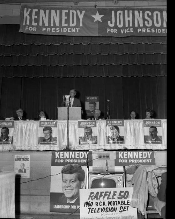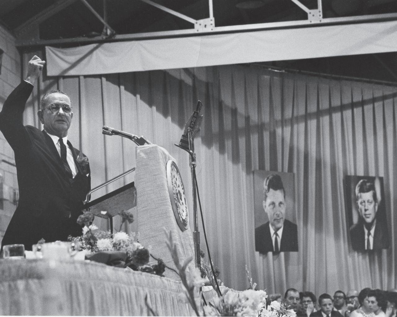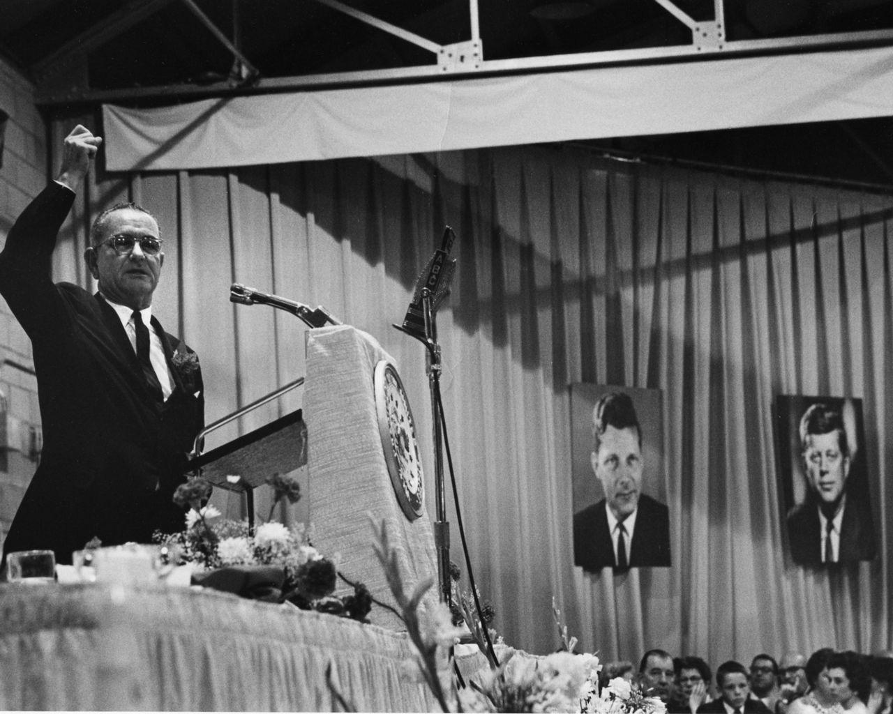 Vice President Lyndon B. Johnson speaks on the Frontier Pavilion stage during an appreciation dinner being held for U.S. Senator Gale McGee of Wyoming, July 13, 1963