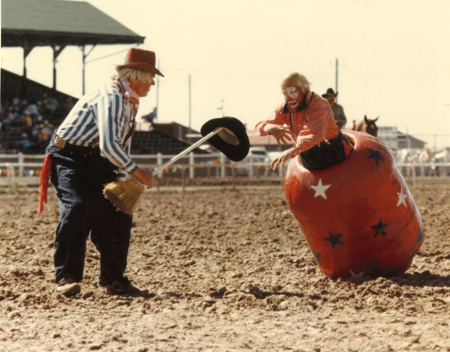 Plaugher retired from CFD in 1983 after being “helped” onto the roof of the photo pit by a particularly lively bull. Dobbs carried on for another 16 years, finally retiring in 1999. Together, they helped shape CFD’s reputation as a rodeo where anything could happen and where the entertainment was just as thrilling as the competition. Their comedic timing, daring stunts, and undeniable charm ensured that their legacy would live on in rodeo history.