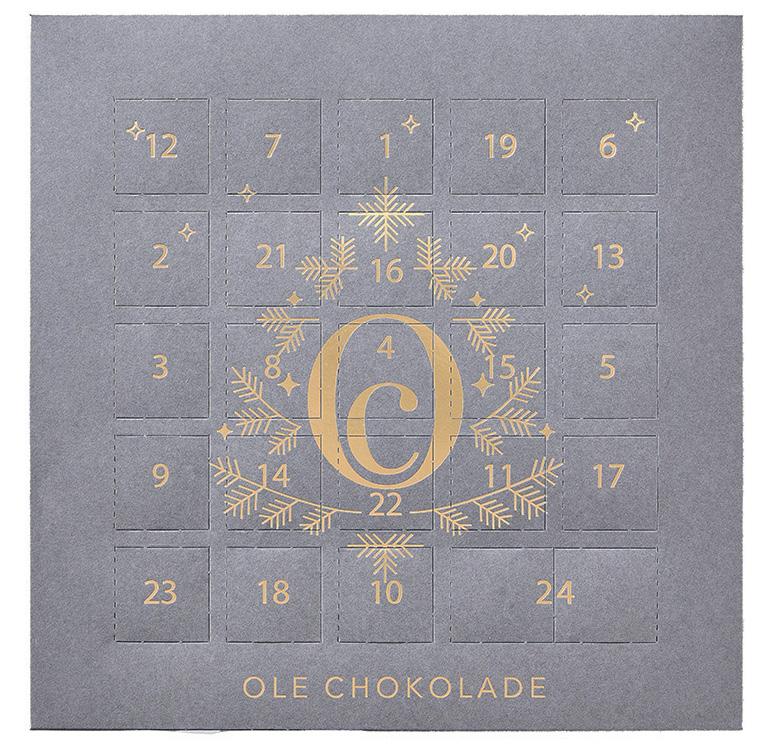 Julens lækkerier i én æske, hvor bunden folder sig ud. Indeni venter julefigurer, lækre, håndlavede chokoladestænger, dragerede mandler, chokoladebarer og ikke mindst vores luksusstykker i forskellige smagsvarianter.
