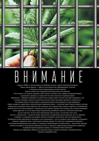 Журнал «ТРАВА» не пропагандирует употребление конопли и других психотропных веществ. Главная задача журнала — ликбез на конопляную тему, информирование читателей и освещение главных международных cannabis-событий. Журнал издаётся для интернациональной русскоязычной аудитории. Стоит помнить, что читатели, живущие в США, Испании или Чехии, могут свободно экспериментировать с растениями и урожаем, а в странах СНГ это может окончиться тюремным сроком. Наркомания — проблема, касающаяся не только России, каждая страна в той или иной мере сталкивается с ней и пытается её решать, исходя из накопленных научных знаний, культурных традиций и толерантности. В настоящий момент методы борьбы с наркоманией условно можно разделить на два направления. Первое, назовём его «европейское», признаёт реалии современной жизни — множество людей, главным образом, молодых, периодически употребляет лёгкие наркотики. Для понимания этого подхода можно провести параллель с употреблением алкоголя (хотя это не совсем правильно с медицинской точки зрения). В рамках этого подхода люди, которые употребляют лёгкие наркотики, это те же люди, которые периодически употребляют алкоголь в небольших количествах. Да, есть опасность, что они станут алкоголиками. Или не станут, что случается очень часто. Так же и с наркоманами — множество людей, периодически употребляющих лёгкие наркотики, так и не переходят к тяжёлым, а со временем, как правило, перестают употреблять даже лёгкие. При этом периодическое употребление лёгких наркотиков не сказывается на их социализации — они не становятся «дном общества», не разрывают семейные и дружеские связи и порой делают успешную карьеру. Это статистика, подтверждённая временем, и в большинстве европейских стран исходят из понимания подобных вещей. Там давно поняли — ужесточение законодательства не приводит к уменьшению наркомании. Россия, к сожалению, выбрала второе, репрессивное направление, но редакция журнала выражает надежду, что положение может измениться. Повторно: вся информация, собранная на страницах номера, не является пособием и подстрекательством. Никогда не нарушайте закон.