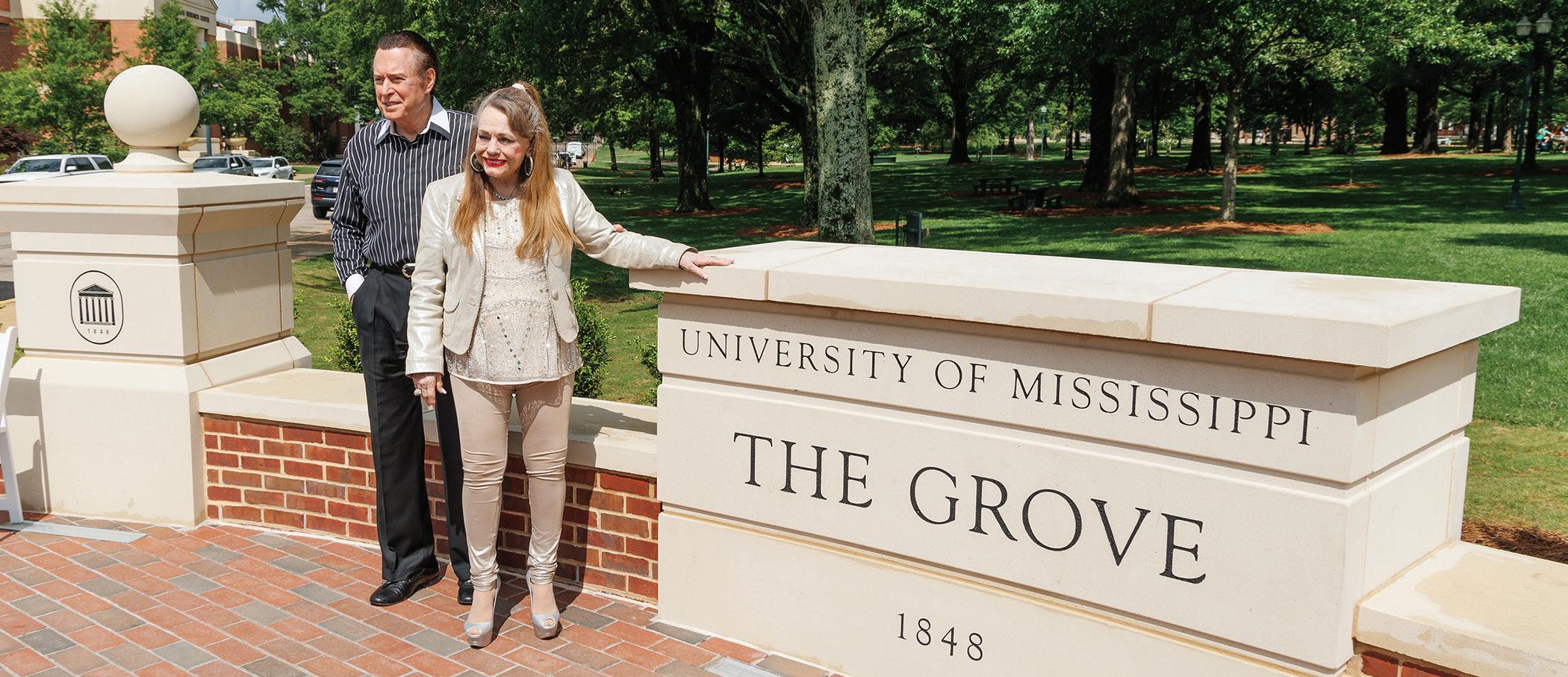 Donors Sunny and Mac (BBA 68) Haik, of Houston, Texas, were honored at a ceremony dedicating the Grove Plaza to his mother, the late Frances Haik Jordan, of Meridian and Decatur. The signage includes landscaping and a plaque that reads, “In memory of Frances Haik. She loved Ole Miss and the Grove.”