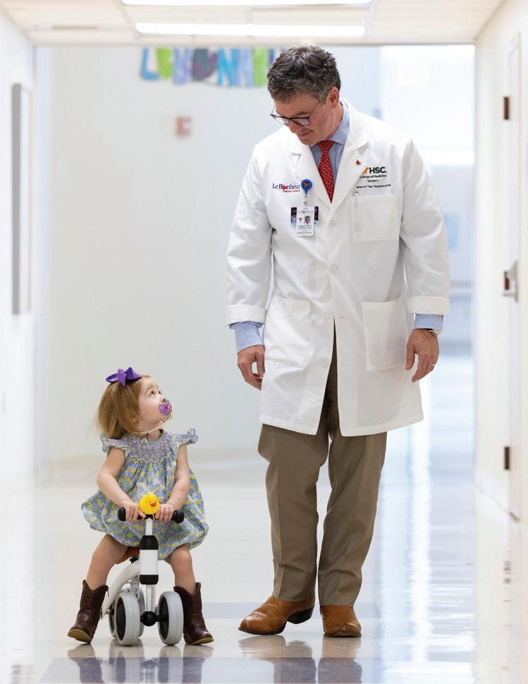 Dr. James ‘Trey’ Eubanks (BSPh 90, MD 94), recently named president of Le Bonheur Children’s Hospital in Memphis, pictured with a surgical patient, Elizabeth Lasley, has served the