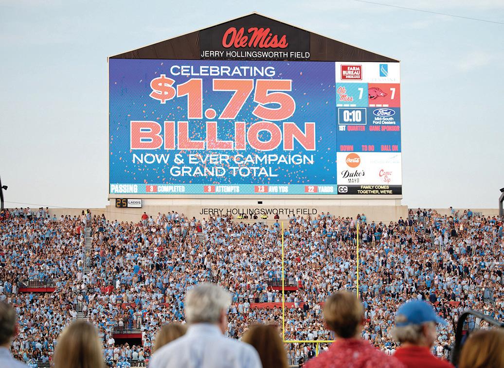 I am immensely proud to announce that the Now & Ever campaign raised an unprecedented $1.75 billion, making it the largest fundraising campaign in state history. Nearly 95,000 donors invested in scholarships, health care initiatives, endowed faculty positions and transformative facilities that will serve our students and state for generations to come. Another important milestone is our endowment surpassing $1 billion, which places Ole Miss among a select group of peer institutions. Thank you for your commitment to our university’s mission and future!