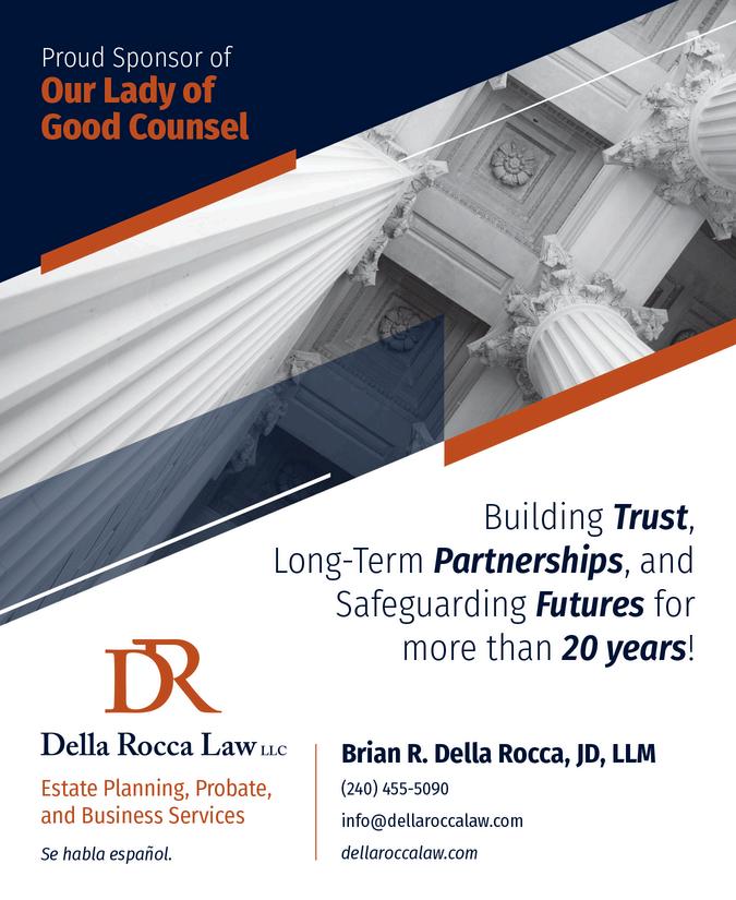 I want to commend our behind-the-scenes team for their tremendous effort and meticulous planning that made this event possible Thank you to our stalwart sponsors for your continued support I’d particularly like to recognize our Grand Celebration committee, chaired by Kristi Weaver ’96, P ’23, and Grace Middleton P ’29, and the members of the Advancement team, led by Jessica Laird Your passion and dedication to Good Counsel shine through every aspect of this evening (See page 10 for full listing )