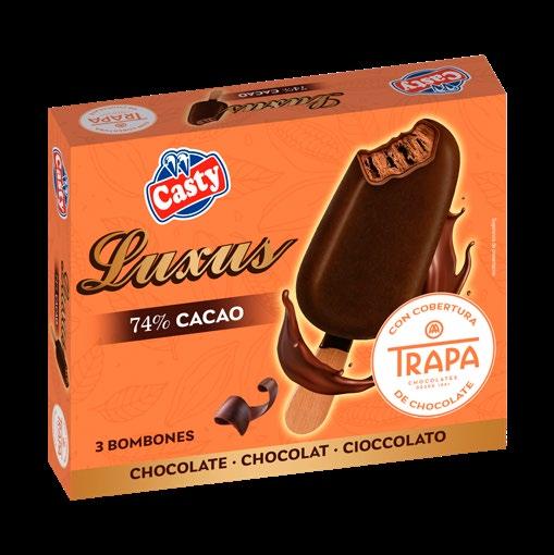 Chocolates Trapa se alía con Helados Casty para lanzar Luxus 74% Cacao by Trapa, un nuevo bombón helado de chocolate que llegará esta primavera a tiendas, supermercados y horeca. La colaboración coincide con el 135 aniversario de Trapa y los 35 años del bombón Luxus. El producto combina tres chocolates, relleno de crema de chocolate negro y cobertura Trapa con un 74% de cacao.